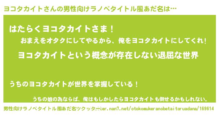 | 女子向けラノベタイトル風あだ名 | 『異世界で失敗しない100のヨコタカイト』 |