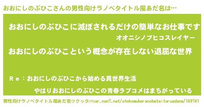 | 女子向けラノベタイトル風あだ名 | 『異世界で失敗しない100のおおにしのぶひこ』 |