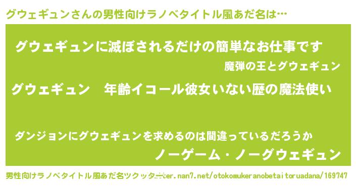 | 女子向けラノベタイトル風あだ名 | 『グウェギュンの玉の輿計画!』 |