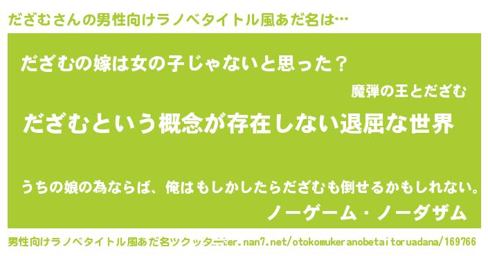 | 女子向けラノベタイトル風あだ名 | 『異世界で失敗しない100のだざむ』 |