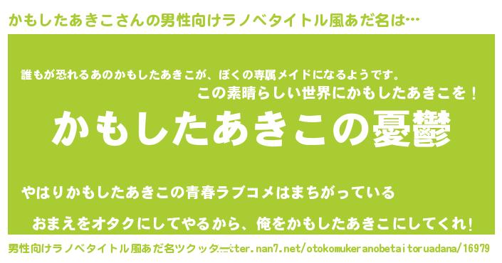 | 女子向けラノベタイトル風あだ名 | 『かもしたあきこ姫と円卓の騎士』 |