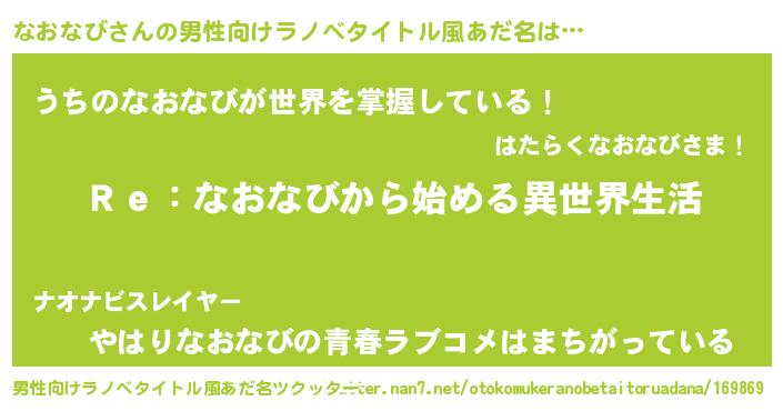 | 女子向けラノベタイトル風あだ名 | 『闇のなおなび』『なおなびの雑貨屋さん』 |