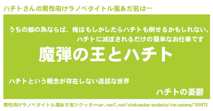 | 女子向けラノベタイトル風あだ名 | 『乙女ゲームの破滅フラグしかない悪役ハチトに転生してしまった…』 |