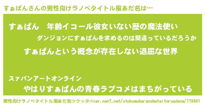| 胡散臭い通販商品みたいなあだ名 | 『絶対に幸福をもたらす水素水…その名も「すぁぱん」』 |