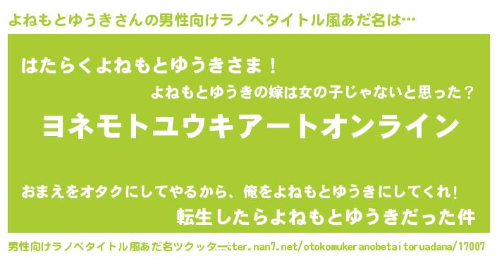 | 女子向けラノベタイトル風あだ名 | 『誰かこのよねもとゆうきを説明してください! ~契約から始まるウェディング~』 |