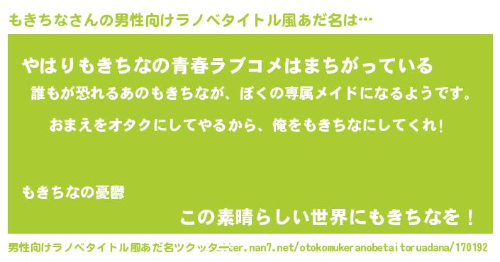 | 女子向けラノベタイトル風あだ名 | 『もきちな恋絵巻』『もきちなの契約王妃』 |