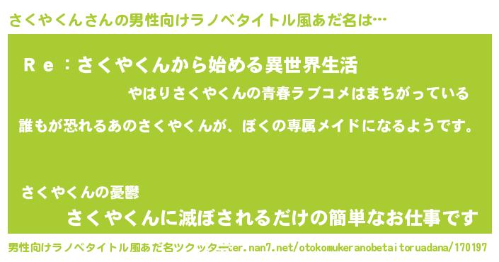 | 意味不明あだ名 | 『永久保存さくやくん』『自称さくやくん』 |