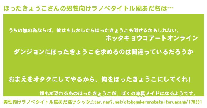 | 胡散臭い通販商品みたいなあだ名 | 『信頼と実績のサプリメント…その名も「ほったきょうこ」』 |