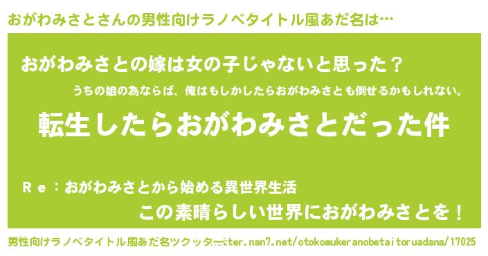 | 女子向けラノベタイトル風あだ名 | 『婚約破棄系悪役おがわみさとに転生したので、保身に走りました。』 |