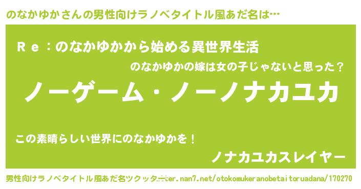 | 女子向けラノベタイトル風あだ名 | 『死神のなかゆかの再婚』 |