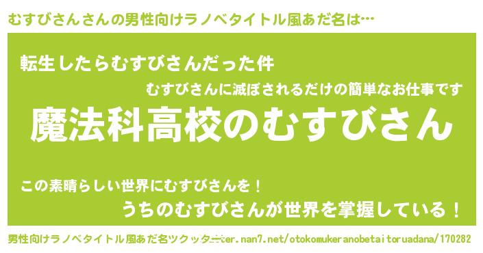 | ヒーロー風カッコイイあだ名 | 『超時空戦士ムスビサン』『仮面ムスダー』 |