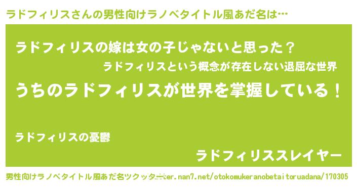 | 女子向けラノベタイトル風あだ名 | 『男装ラドフィリスの憂鬱な任務』 |