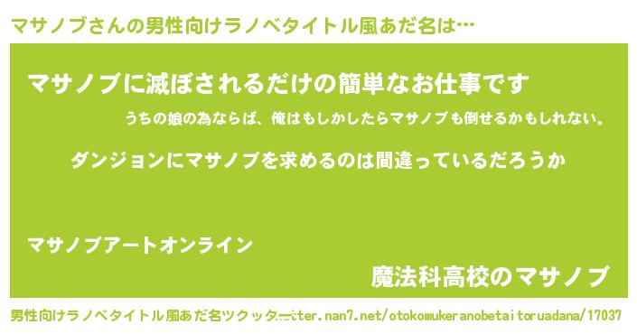 | 胡散臭い通販商品みたいなあだ名 | 『信頼と実績のサプリメント…その名も「マサノブ」』 |