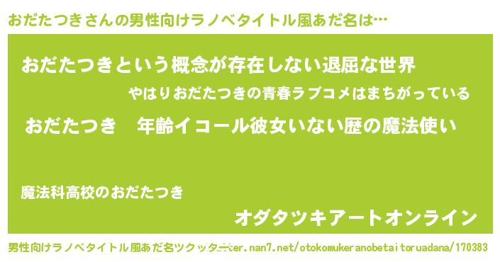| 女子向けラノベタイトル風あだ名 | 『おだたつきの玉の輿計画!』 |