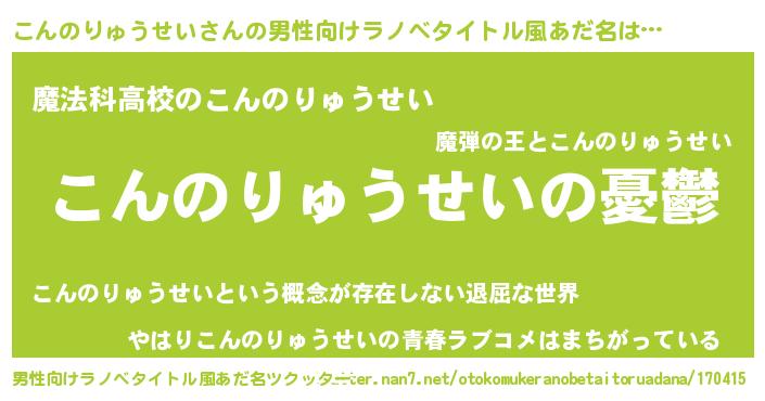 | 女子向けラノベタイトル風あだ名 | 『(仮)こんのりゅうせいのやんごとなき事情』 |