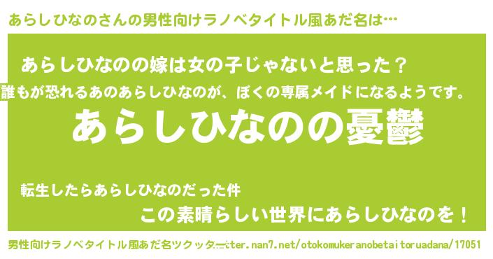 | 女子向けラノベタイトル風あだ名 | 『(仮)あらしひなののやんごとなき事情』 |