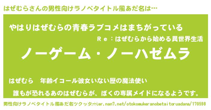 | 女子向けラノベタイトル風あだ名 | 『死神はぜむらの再婚』『闇のはぜむら』 |