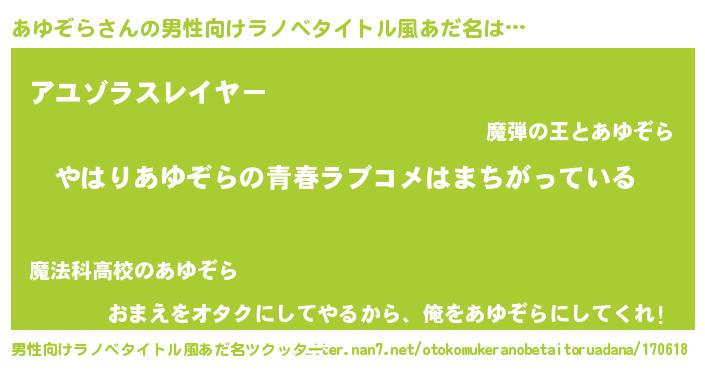 | 女子向けラノベタイトル風あだ名 | 『あゆぞらの雑貨屋さん』 |