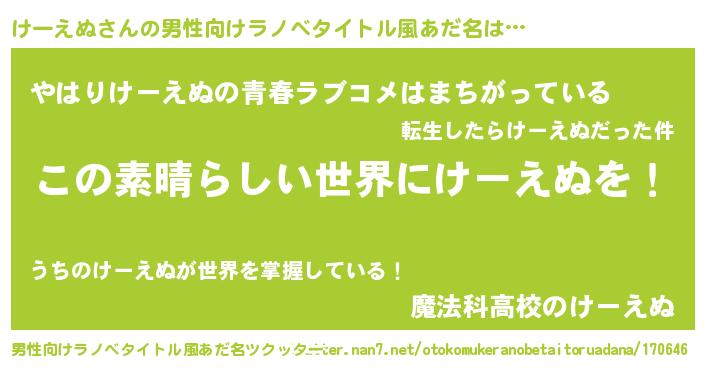 | 女子向けラノベタイトル風あだ名 | 『乙女ゲームの破滅フラグしかない悪役けーえぬに転生してしまった…』 |