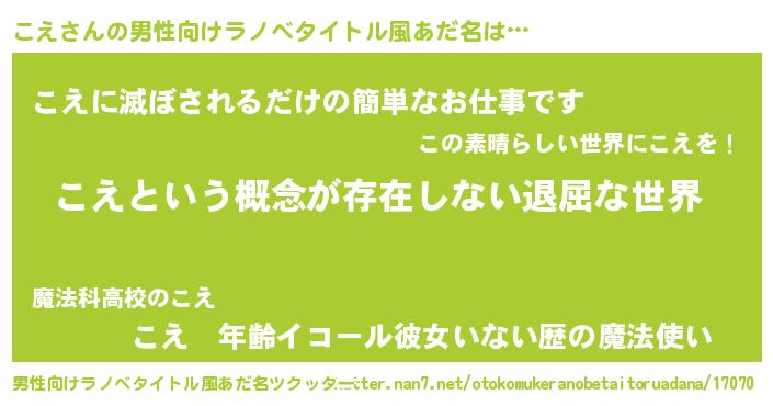 | 女子向けラノベタイトル風あだ名 | 『異世界で失敗しない100のこえ』 |