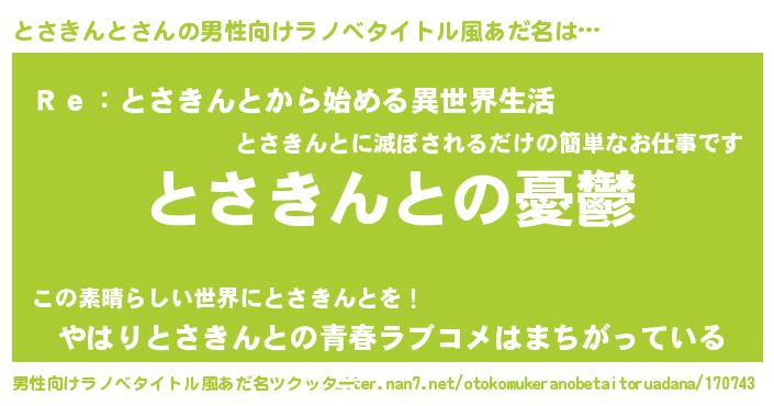 | 女子向けラノベタイトル風あだ名 | 『(仮)とさきんとのやんごとなき事情』 |