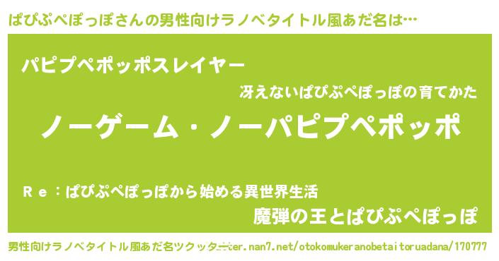 | 女子向けラノベタイトル風あだ名 | 『死神ぱぴぷぺぽっぽの再婚』 |