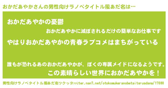 | 女子向けラノベタイトル風あだ名 | 『おかだあやかの雑貨屋さん』 |