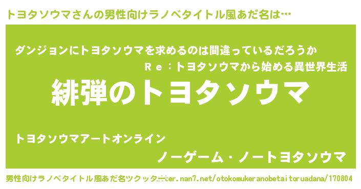 | 意味不明あだ名 | 『とにかく怪しいトヨタソウマ』 |