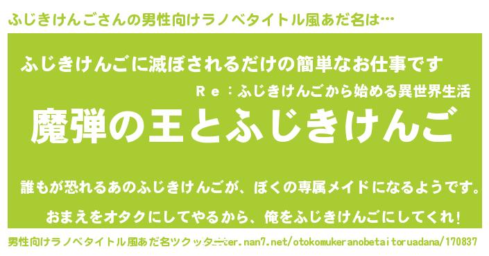 | 女子向けラノベタイトル風あだ名 | 『乙女ゲームの破滅フラグしかない悪役ふじきけんごに転生してしまった…』 |