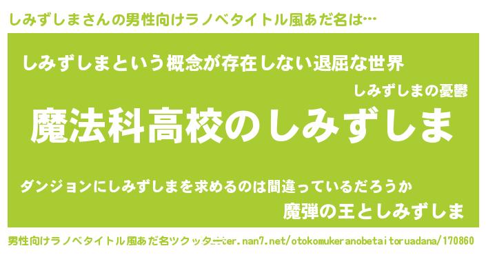 | 女子向けラノベタイトル風あだ名 | 『しみずしまなんてお断りですっ。』 |