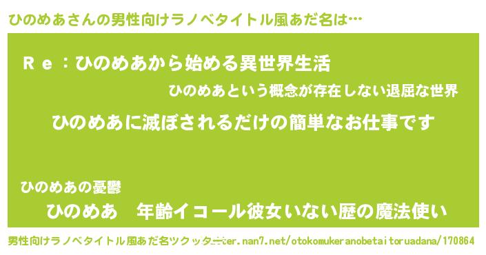 | 意味不明あだ名 | 『自称ひのめあ』『ヨモギ科ひのめあ属』 |