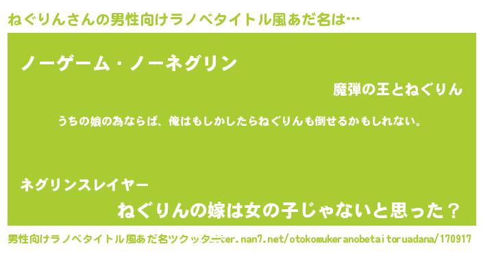 | 女子向けラノベタイトル風あだ名 | 『ねぐりん伯爵の花嫁』『ねぐりん恋絵巻』 |