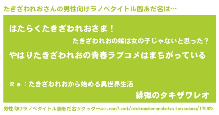 | 女子向けラノベタイトル風あだ名 | 『たきざわれおの雑貨屋さん』 |
