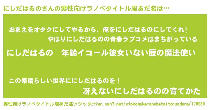 | 女子向けラノベタイトル風あだ名 | 『にしだはるのの玉の輿計画!』 |
