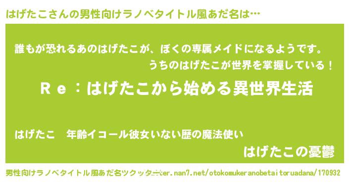 | 女子向けラノベタイトル風あだ名 | 『闇のはげたこ』『はげたこの契約王妃』 |