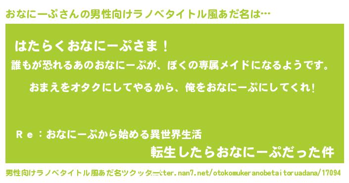 | 女子向けラノベタイトル風あだ名 | 『おなにーぷ夫妻のなれそめ』 |