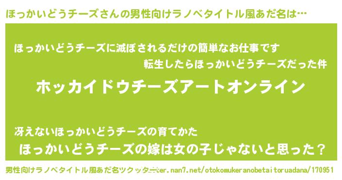 | 女子向けラノベタイトル風あだ名 | 『誰かこのほっかいどうチーズを説明してください! ~契約から始まるウェディング~』 |