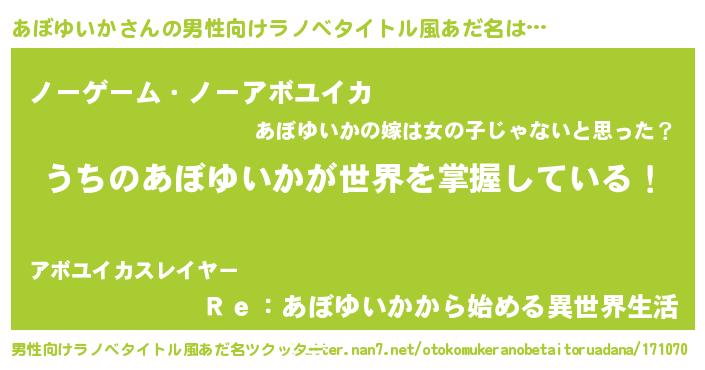 あぼゆいかさんの男性向けラノベタイトル風あだ名をツクッター!