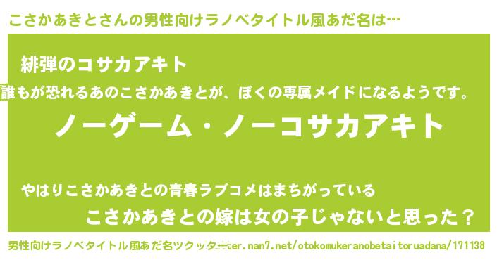 | 女子向けラノベタイトル風あだ名 | 『死神こさかあきとの再婚』 |