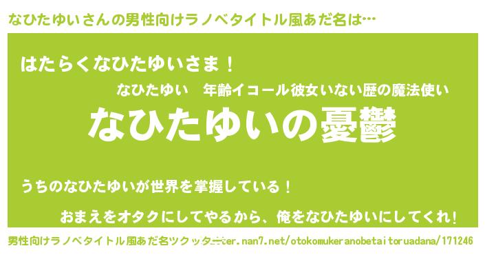 | 女子向けラノベタイトル風あだ名 | 『(仮)なひたゆいのやんごとなき事情』 |
