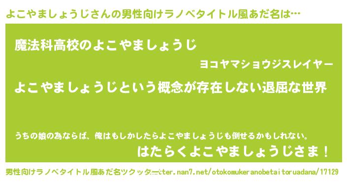 | 女子向けラノベタイトル風あだ名 | 『異世界で失敗しない100のよこやましょうじ』 |