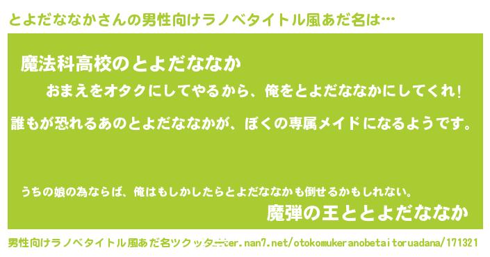 | 胡散臭い通販商品みたいなあだ名 | 『前代未聞の健康食品…その名も「とよだななか」』 |