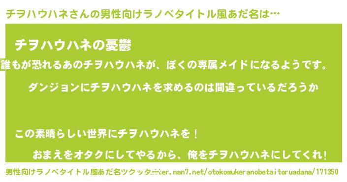 | 女子向けラノベタイトル風あだ名 | 『チヲハウハネの卵を拾いまして』 |