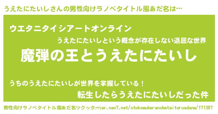 | 女子向けラノベタイトル風あだ名 | 『うえたにたいしが死なない童話 林檎のうえたにたいしの診療簿』 |