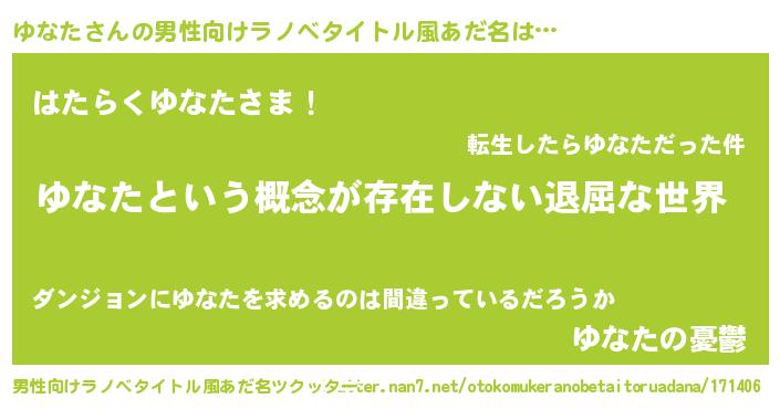 | 胡散臭い通販商品みたいなあだ名 | 『来世でも幸せになれる健康食品…その名も「ゆなた」』 |
