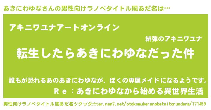 | 女子向けラノベタイトル風あだ名 | 『婚約破棄系悪役あきにわゆなに転生したので、保身に走りました。』 |