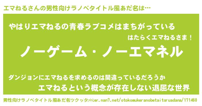 | 女子向けラノベタイトル風あだ名 | 『死神エマねるの再婚』 |