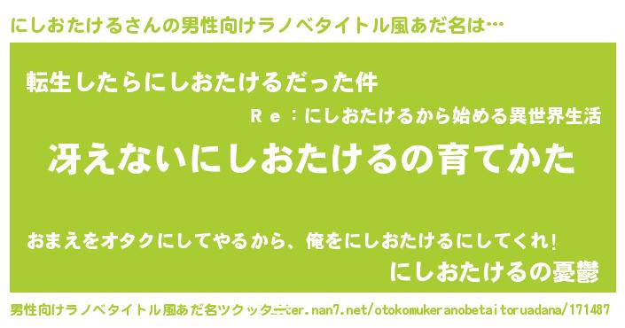 | ヘコむあだ名 | 『にしにー』『にしおたける(小並感)』 |