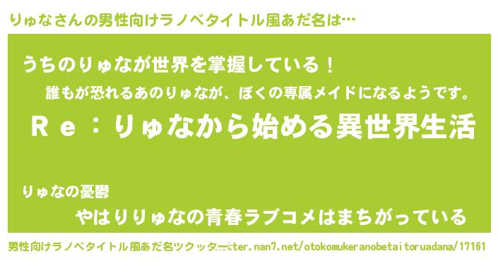 | 女子向けラノベタイトル風あだ名 | 『闇のりゅな』『男装りゅなの憂鬱な任務』 |