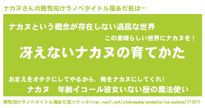 | 胡散臭い通販商品みたいなあだ名 | 『来世でも幸せになれる水素水…その名も「ナカヌ」』 |